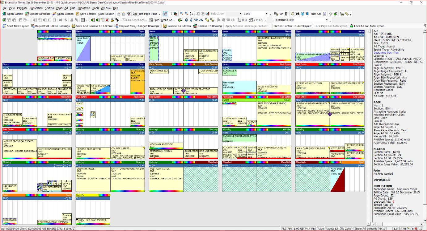 Users can confirm at a glance ad placement, advertiser details, copy control information, ad artwork previews, finished page previews, financial information on an ad, page, section and edition level & much more, updated in real time.