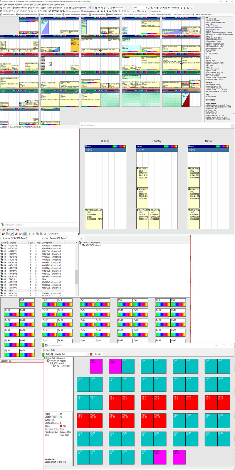 Advertising data is collated & used to distribute advertisements across pages according to publication requirements, press configuration, advertisement requirements and priority.